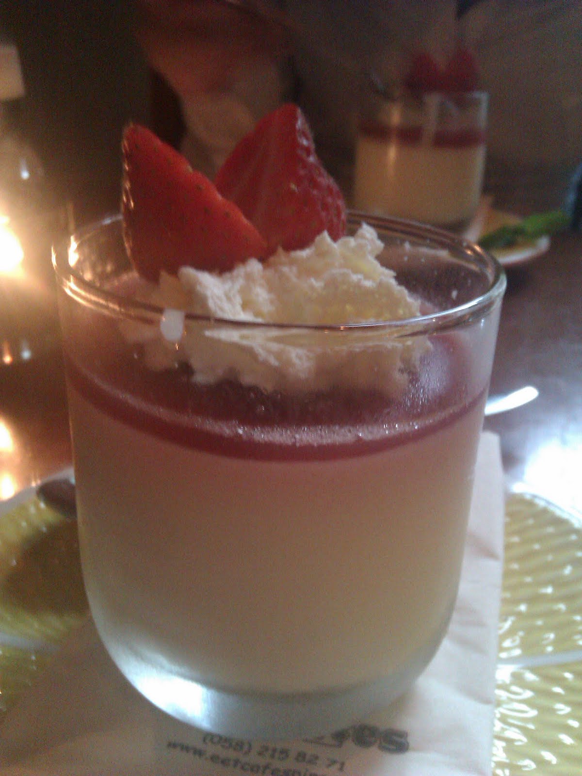 Het toetje was bavarois van sinaasappel en aarbeiengelei (ik vond het naar rosé smaken) en slagroom.