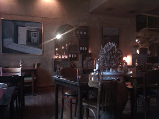 Afgelopen dinsdag was het noodweer in Nederland. Een goed moment om uit eten te gaan. Voordeel, geen overvolle restaurants. Ik had nog bonnen van Voordeel Vinden voor eetcafé Spinoza. Ik had veel over de mooie binnentuin gehoord en was zeker van plan om op een mooie zomerse dag daar te eten. Helaas, zomer 2011 was zeer nat. Ik zag tijdens het dineren een aantal paraplu's buiten hangen voor de gasten. Wat attent. Er is aan alles gedacht. Op het eerste gezicht lijkt het of ze bij het interieur op safe hebben gespeeld, bruin en waxinelichtjes.