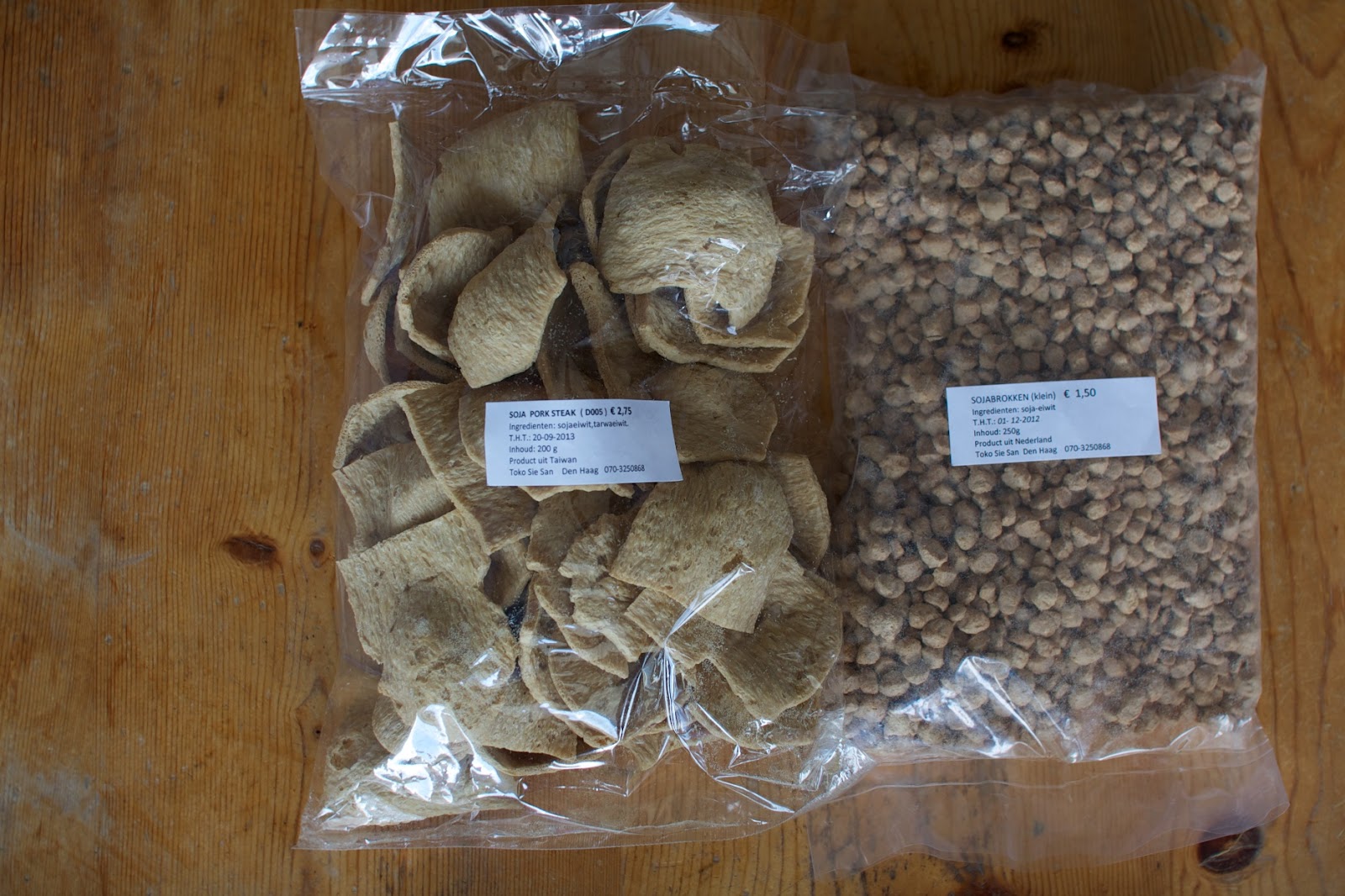 Als niet-vegetariër heb je zoiets van, "Is dat wel te vreten?' Nou, de soja pork steaks zijn best lekker. Ik rook eraan en ik had zoiets van, 'Op hoop van zegen.' Er werd mij verteld dat ik het een half uur moest laten wellen. De hoeveelheid water is op goed geluk.