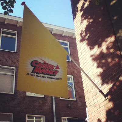 Tot en met 1 juni ben ik te vinden in Groningen. Ik hoorde vanmorgen dat de crisis al vier jaar aan de gang is. De laatste jaren zie je dan ook overal winkels opduiken met executieverkopen. Of het nou echt executieverkopen zijn, betwijfel ik ten zeerste. De meeste winkels hebben dezelfde voorraad, misschien gaat de ene naar de andere winkel failliet en rouleert zo de voorraad. In dat geval zijn ze niet aan het jokken. Ik kwam gisteren dit winkeltje in Groningen tegen, de Crisis Markt. Ik ben niet naar binnen gegaan. Ik moest wel lachen om het logo en de onderschrift. Doet het je niet denken aan een ander bedrijf?